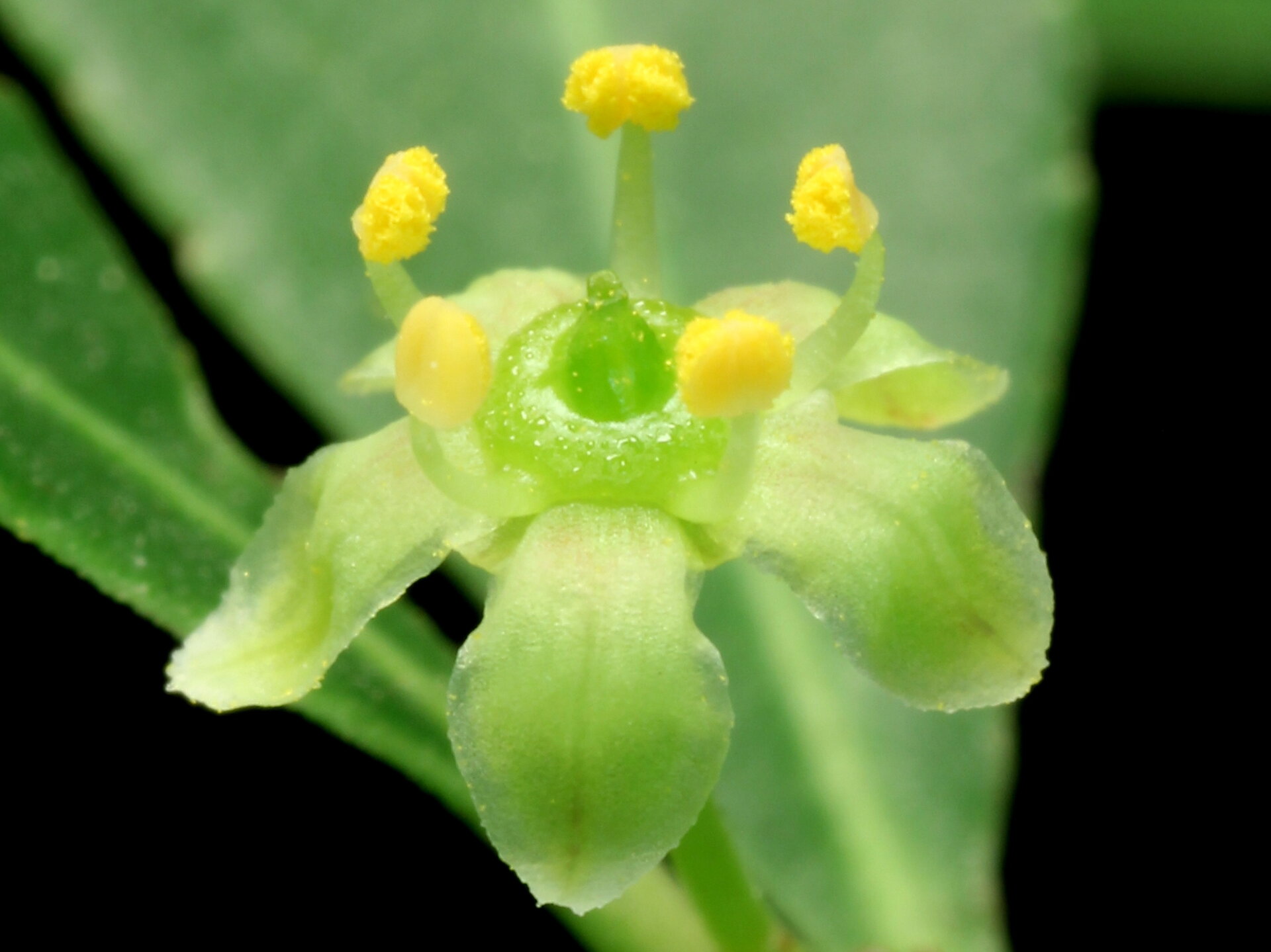 Sus hojas son simples, coriáceas y brillantes, de color verde intenso. Produce pequeñas flores verdosas poco conspicuas, y frutos en cápsulas que al madurar liberan semillas rodeadas de un arilo rojizo-anaranjado.